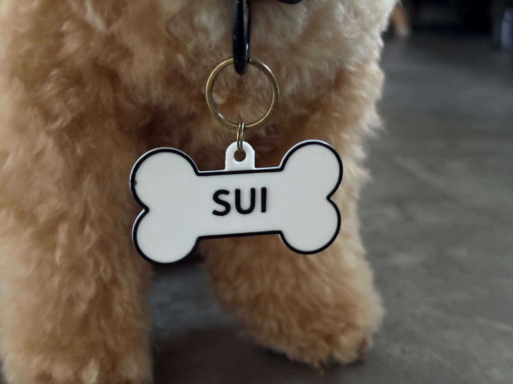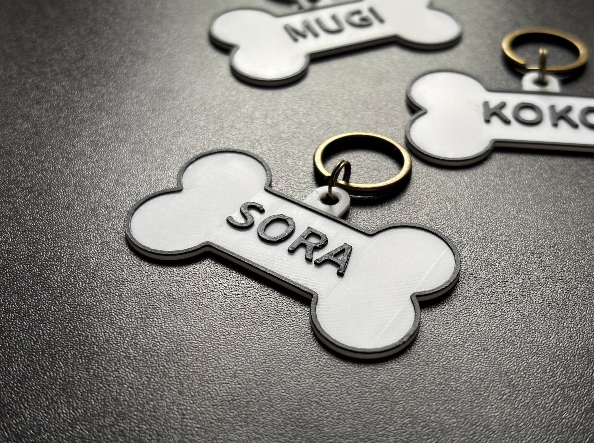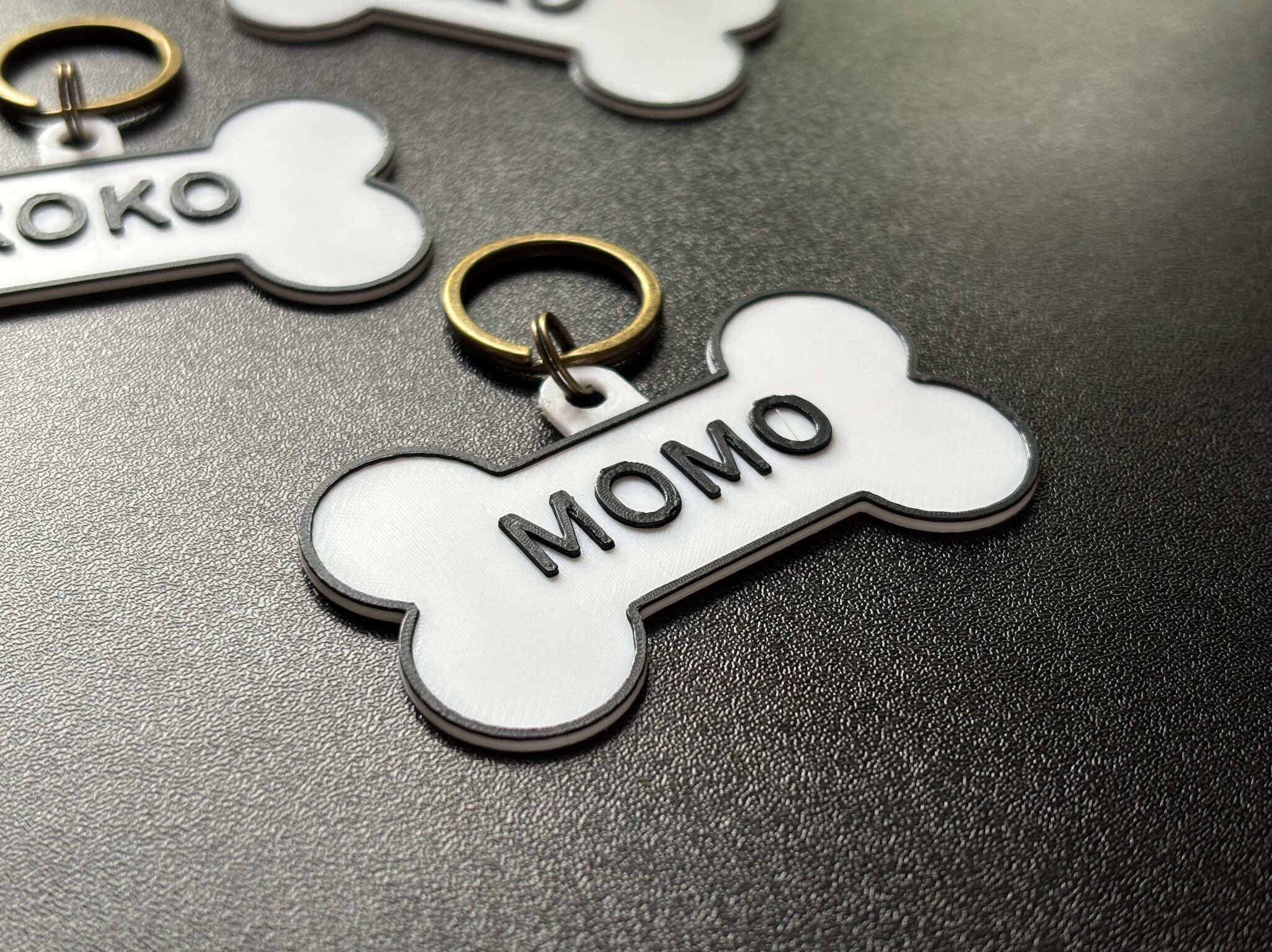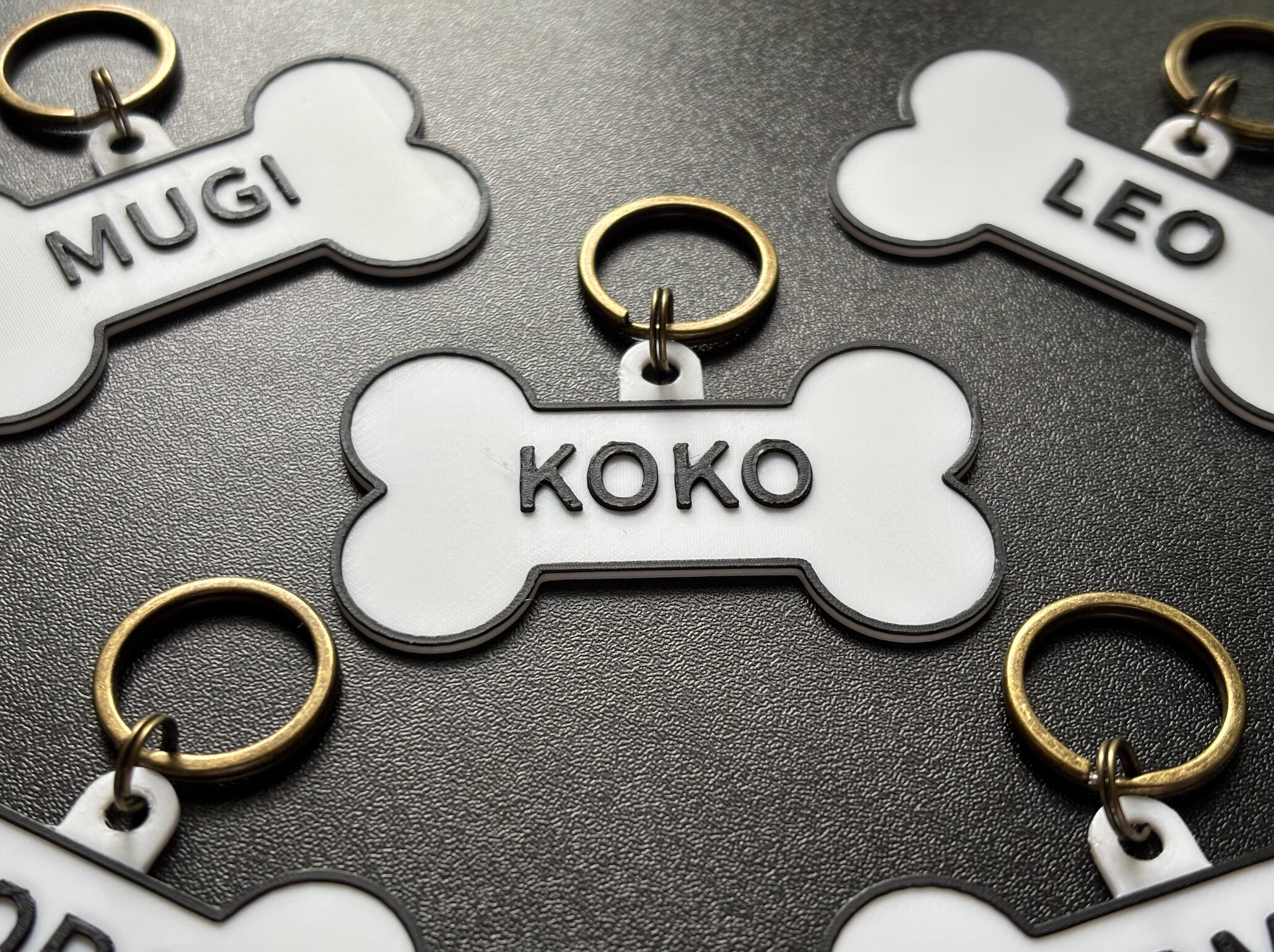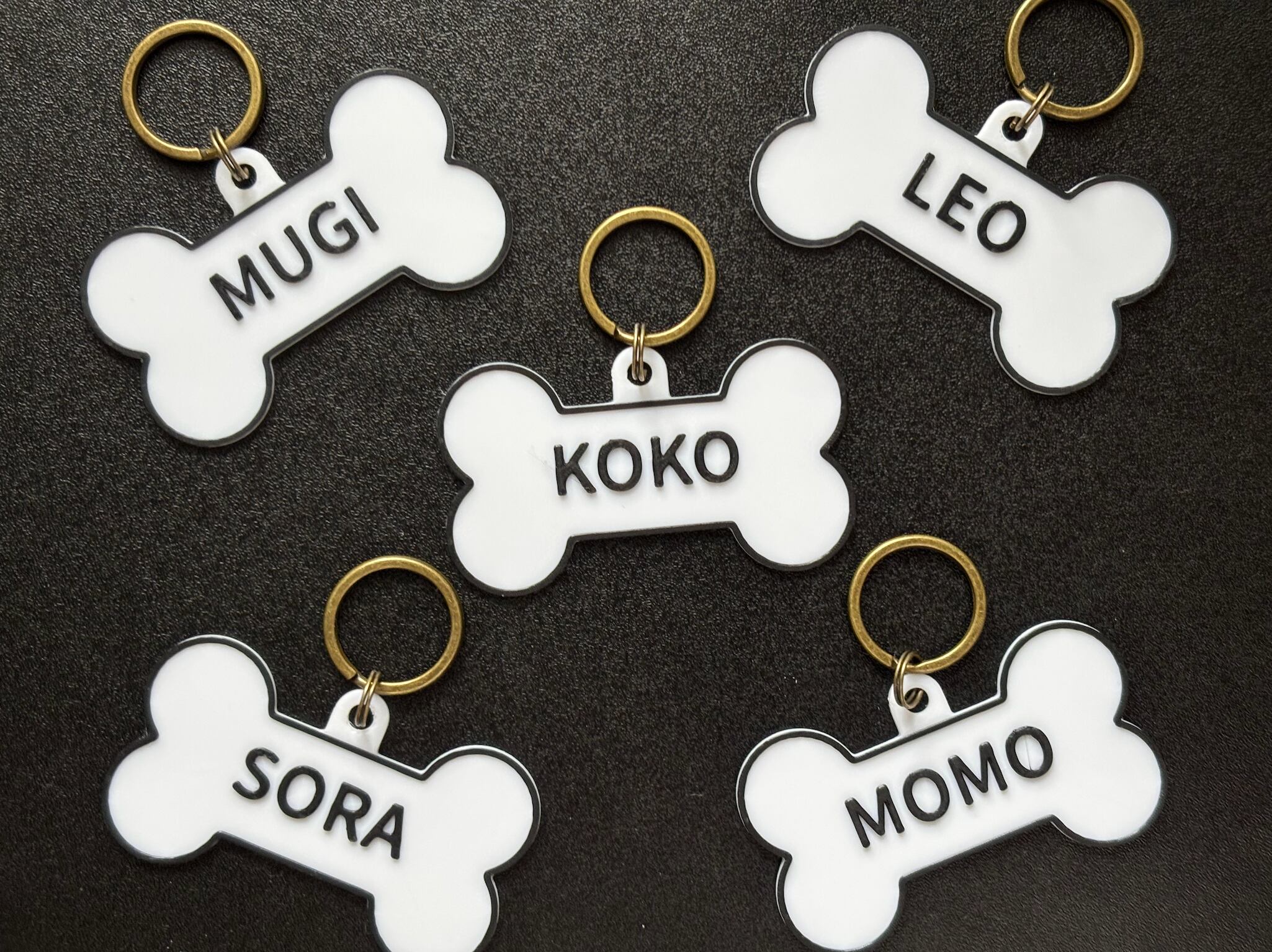 お散歩やお出かけにぴったりの、骨型デザインのネームタグ。